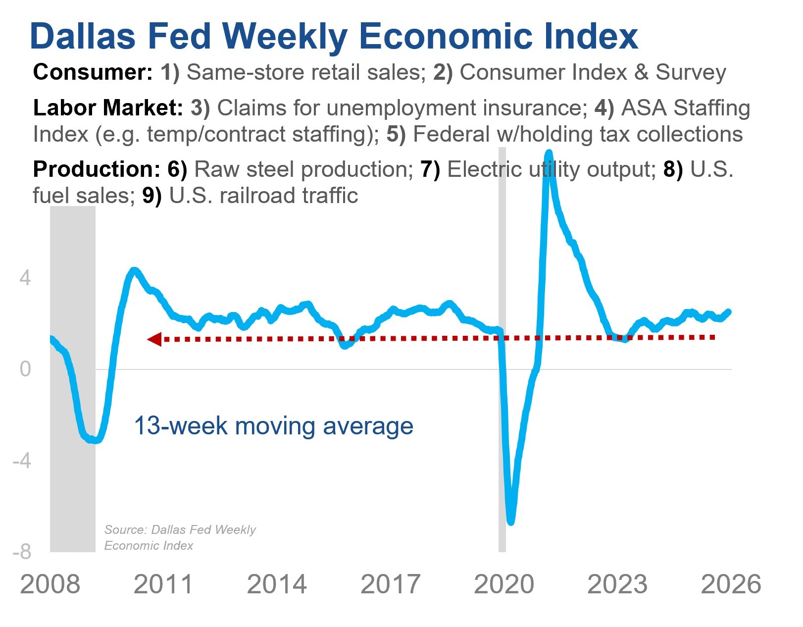 The market’s resilience in the face of war in Iran has come as a surprise to many, and while part of the story is surely the hope that this administration’s penchant for dealmaking will win out, it must be concluded that another part is the underlying strength of the US economy. The question now is how much of that momentum has been eroded by higher energy prices and interest rates. Most economic data we might rely on is not high frequency and high quality (i.e., it’s monthly/quarterly, reported with a lag, oft-revised), so in times like these, I find the Dallas’ Fed’s Weekly Economic Index – a fusion of 10 high‑frequency data series across consumer, labor, and manufacturing – quite useful. Here, we see the series’ 13-week moving average (which approximates annual real GDP growth) at its highest since 2022 and above its 2010-2019 average. Imperfect, yes, (and a longer conflict would certainly change things), but a decent sign that the war has not yet resulted in deep economic deterioration at home.
