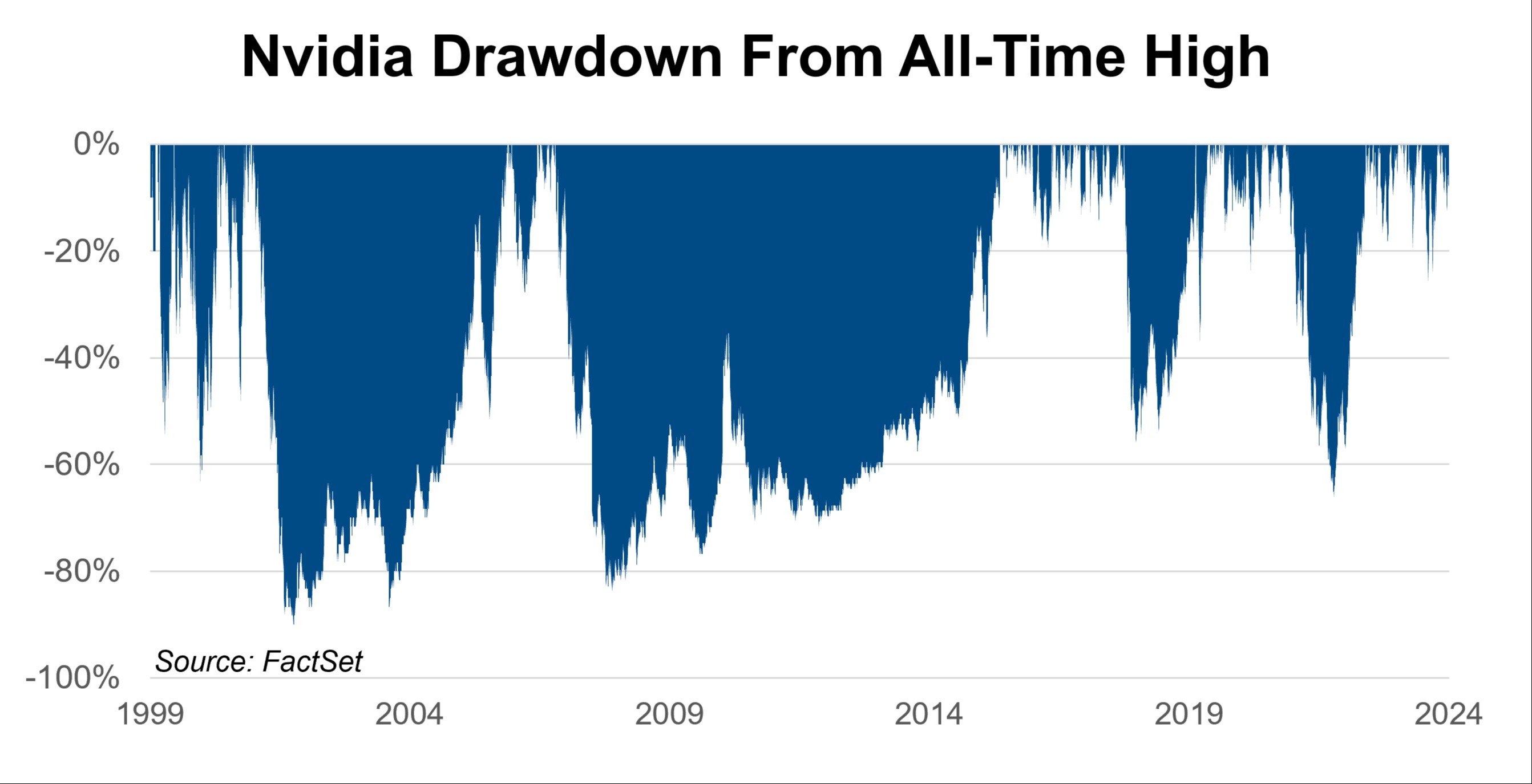 Baked into hindsight bias is an assumption that there are only two relevant points in time: the date a company went public and right now. There can be many years in between those two points, and for most companies, that increase in market value has a multitude of dips and valleys. From its previously all-time high, Nvidia was down 90% in 2002, 85% in 2008, and 65% in 2022 (with many other dips and mini-crashes along the way). And this is not unique to Nvidia – nearly all of the big stock many winners we admire today have experienced gut-wrenching drawdowns and crises of investor confidence. While Charlie Munger famously asserted that, “if you’re not willing to react with equanimity to a market price decline of 50% two or three times a century you’re not fit to be a common shareholder,” the patience to withstand such a high degree of volatility from an as-of-yet unproven company is not something most investors possess.