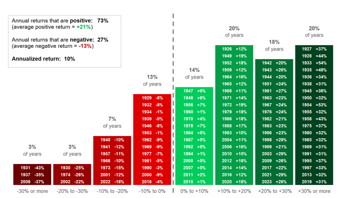 The truth is, the market has risen far more often than it’s fallen, as we display below, and while being a long-term investor is rarely easy, it has paid off handsomely over the last century.