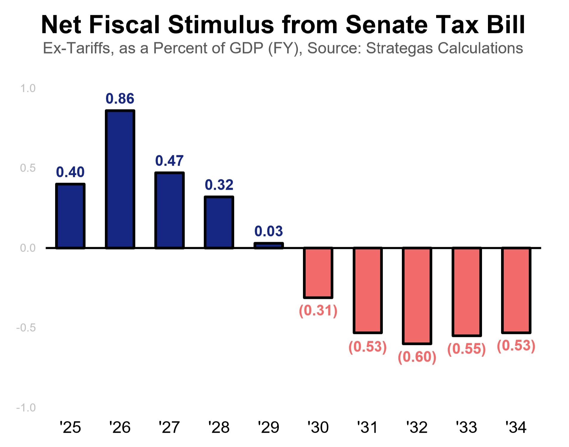 Together, these policies should create a building boom in the U.S. When combined with the consumer tax provisions in the bill, they provide a net fiscal stimulus of 0.4% of GDP in FY25 and of 0.9% of GDP in FY26, helping to offset the impact of tariffs in those years.